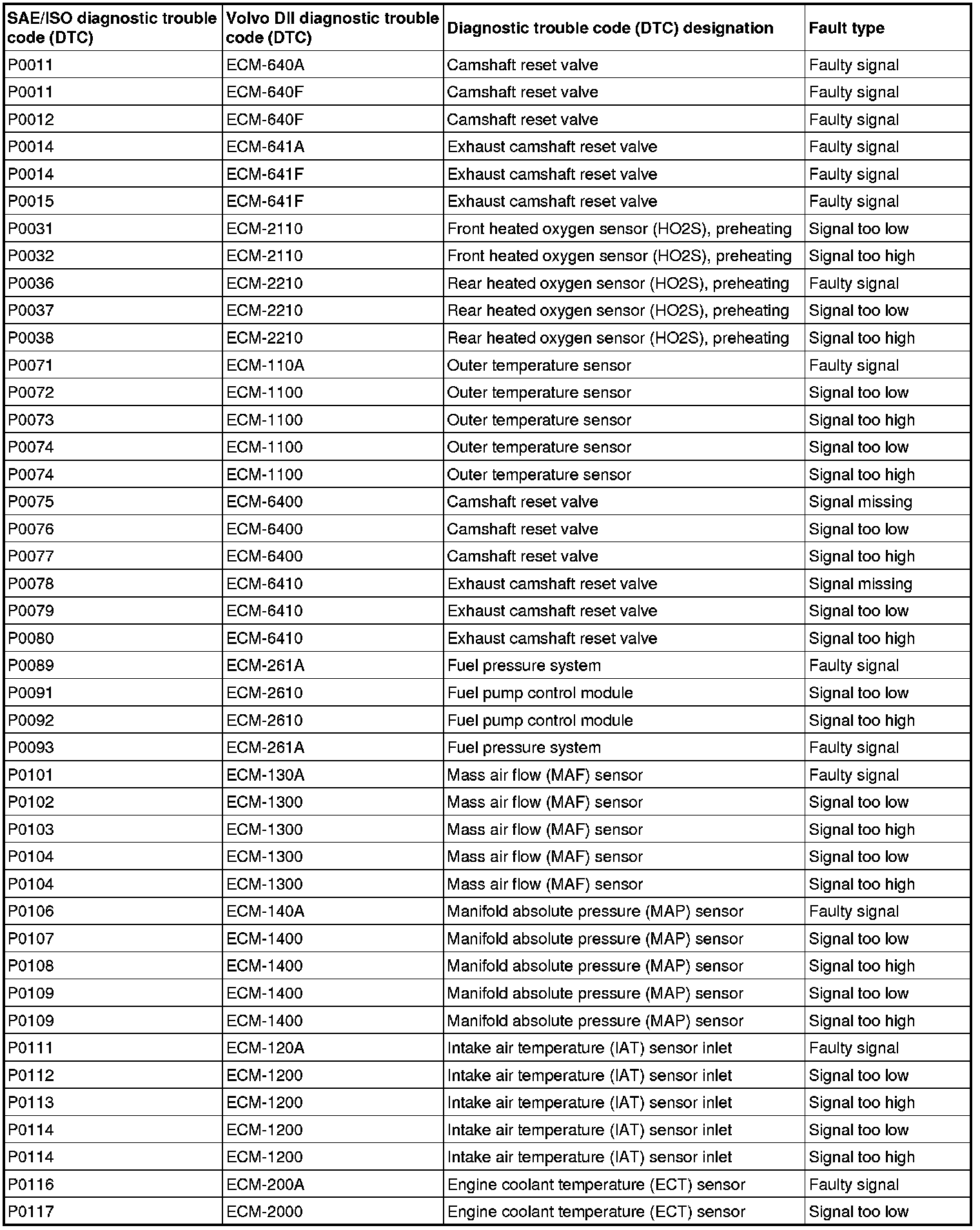 The table below is a conversion table between standardized diagnostic trouble codes (DTCs) (SAE/ISO) and the equivalent Volvo diagnostic trouble codes (DTCs) (DII).
