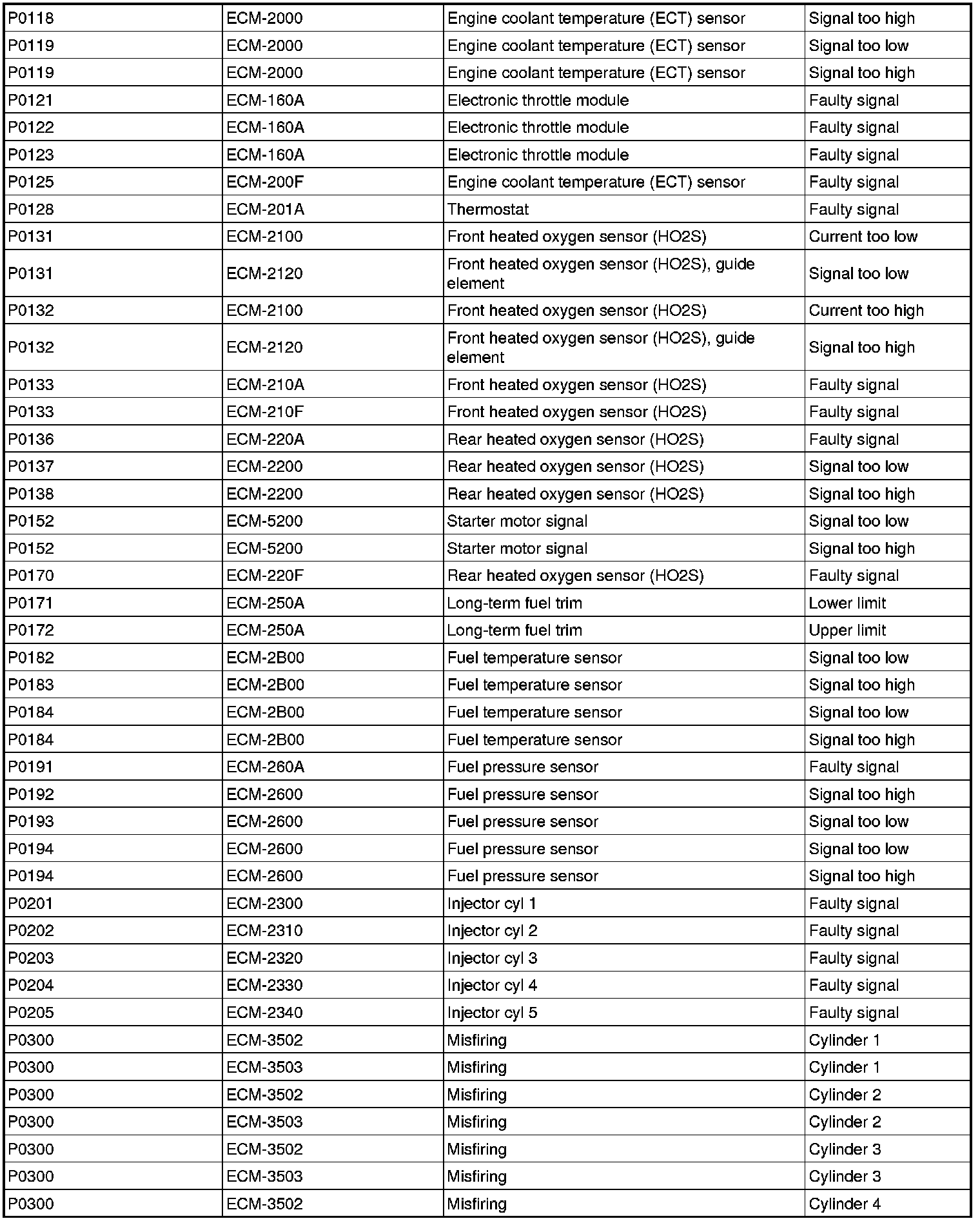 DTC Table (P Codes / ECM Codes) Part 3: