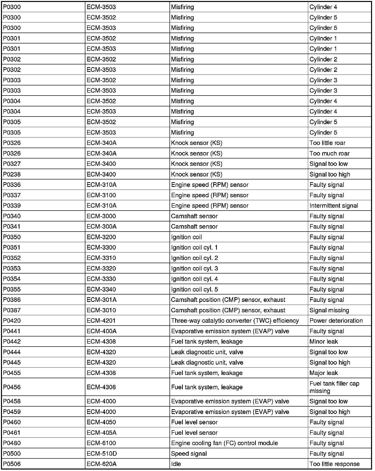 DTC Table (P Codes / ECM Codes) Part 4:
