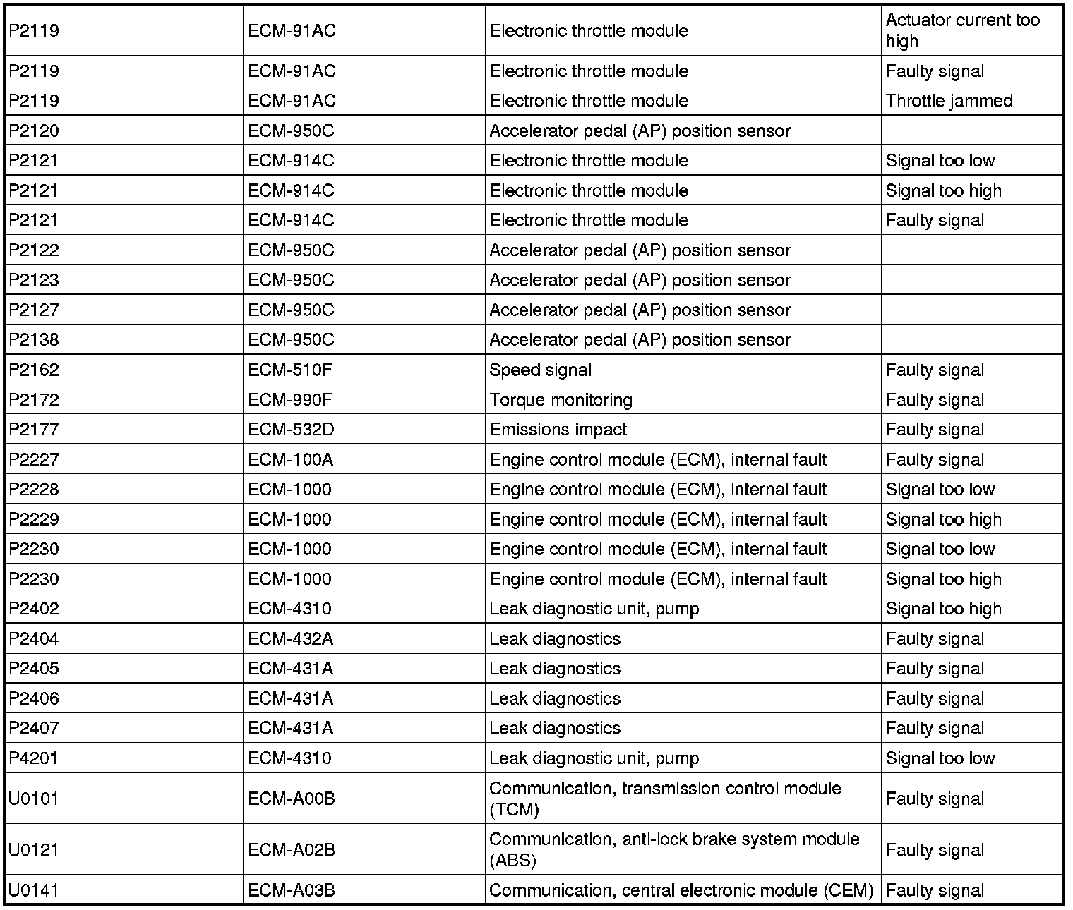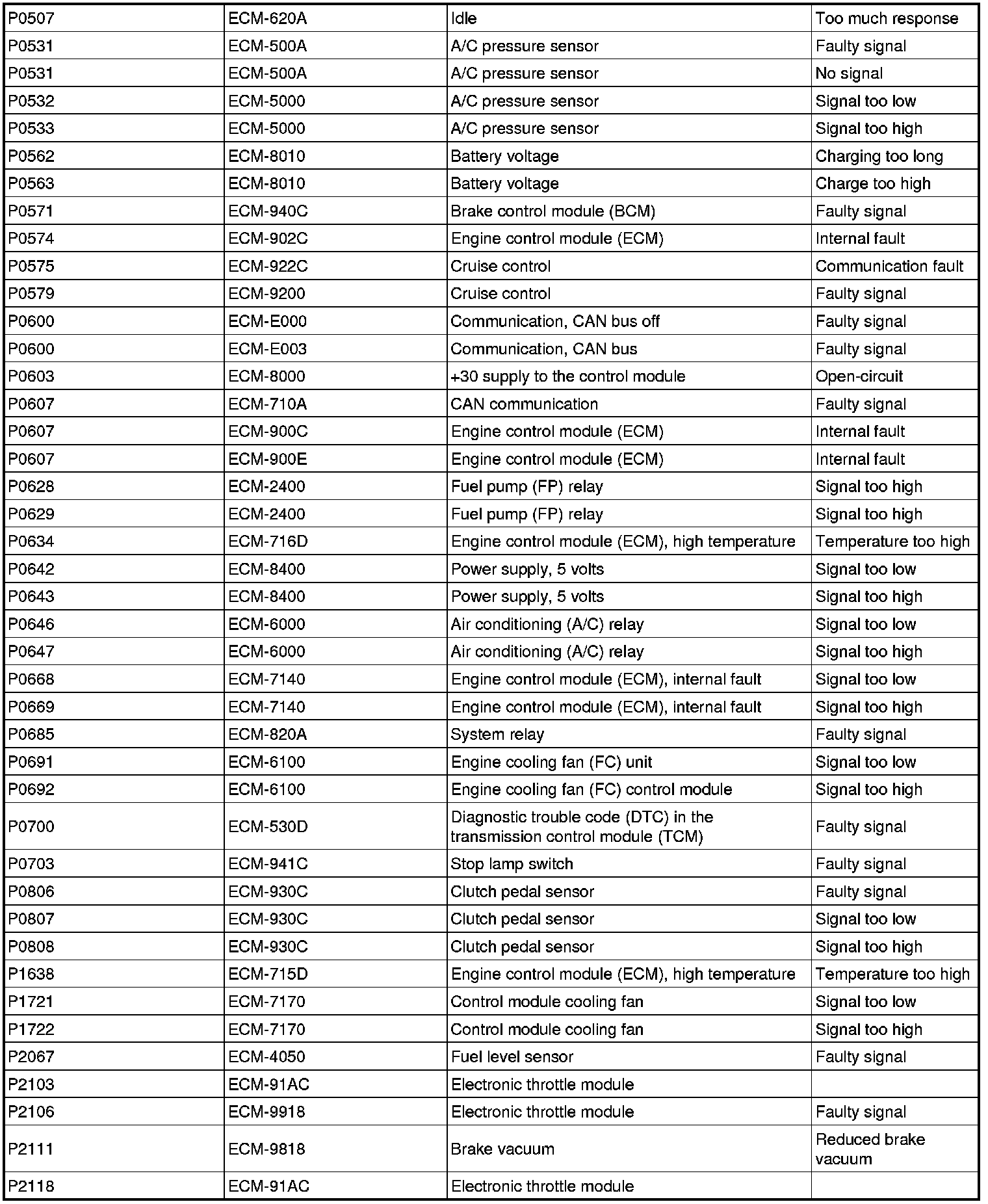 DTC Table (P Codes / U Codes / ECM Codes)