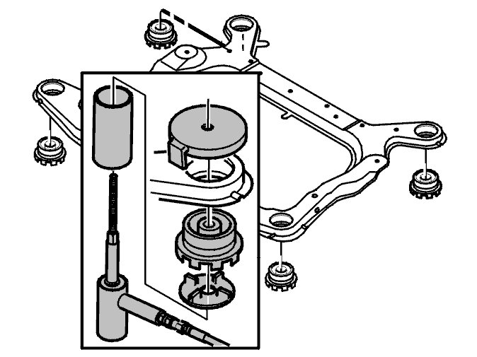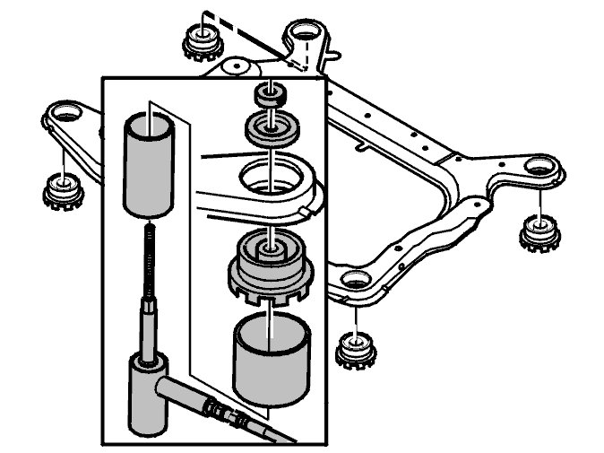 Press the bushings out of the sub-frame, see the following illustration.