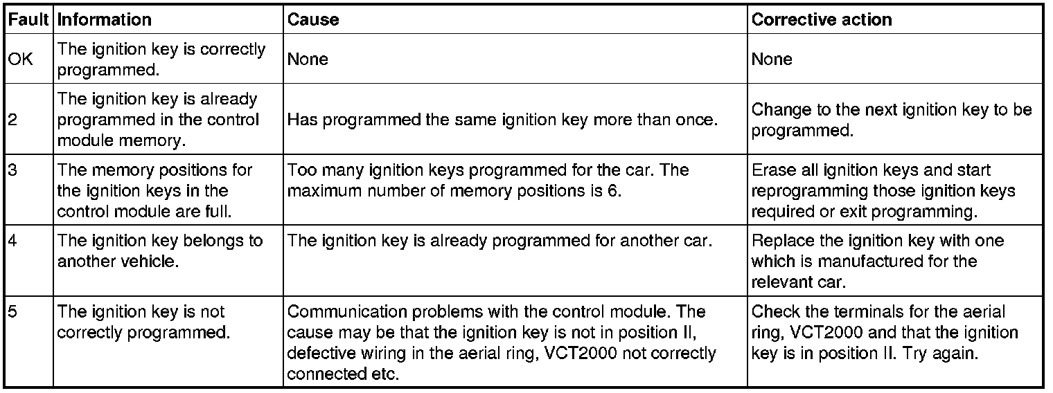 The table gives the different codes for faults which can occur when programming an ignition key.