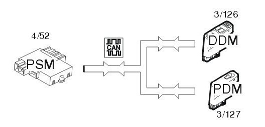 If the car was built in structure week 9950 or later, the car has door mirrors with memories. When the desired memory button is pressed, the mirrors and seat are set to the desired positions. Data is sent from the power seat module (4/52) to the passenger door module (3/126) (3/127) to set the door mirrors to the programmed position. The memory positions of the door mirrors are stored in the driver's door module (DDM) (3/126) and passenger door module (PDM) (3/127). When setting a new mirror position, this is stored in each control module. The position of the driver's door mirror is stored in the driver door module (DDM). The position of the passenger door mirror is stored in the passenger door module (PDM).