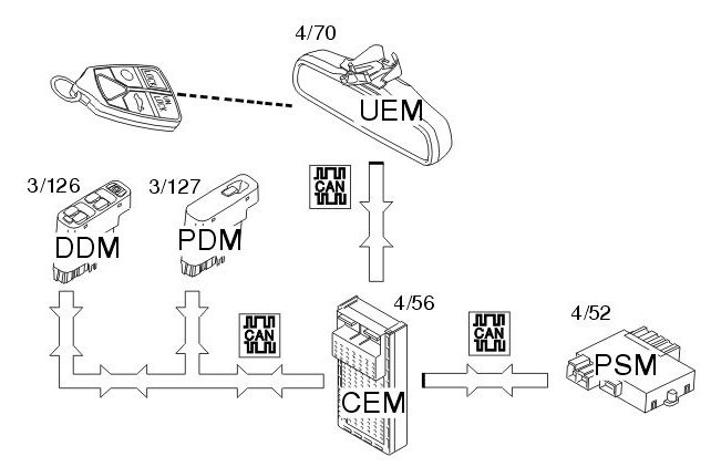 The signal from the remote control is transmitted to the upper control module (UEM) (4/70) when the car is locked or unlocked. The upper electronic module (UEM) also identifies which remote control is being used. The central electronic module (CEM) (4/56) receives this information from the upper electronic module (UEM). The central electronic module (CEM) identifies and stores the remote control which is being used and determines the data to be sent to the power seat module (PSM) (4/52), driver door module (DDM) (3/126) and passenger door module (PDM) (3/127). This is done when the door is opened.