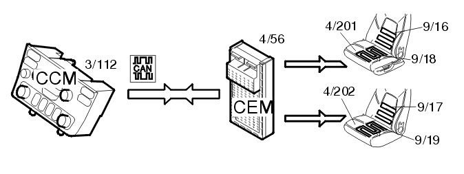 The seat heaters are activated by pressing the switches on the climate control module (CCM) (3/112). The climate control module (CCM) transmits information via the Controller area network (CAN) about the status selected for each seat to the central electronic module (CEM) (4/56). The central electronic module (CEM) then transmits the information to the relevant control module for seat heating (4/201, 4/202). The control modules for the seat heaters then control the current to the heater pad for the left-hand seat (9/16, 9/18) and right-hand seat (9/17, 9/19).