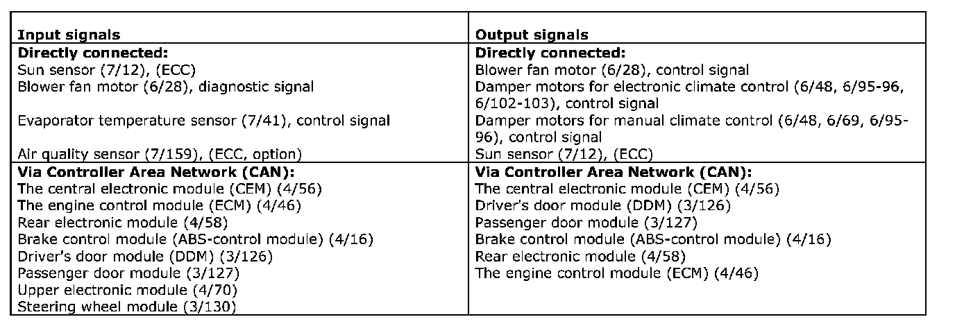 The table below summarizes input and output signals to and from the climate control module. The signal types are divided into directly connected signals, serial communication and Controller area network (CAN) communication. The illustration below displays the same information with the Volvo component designations.