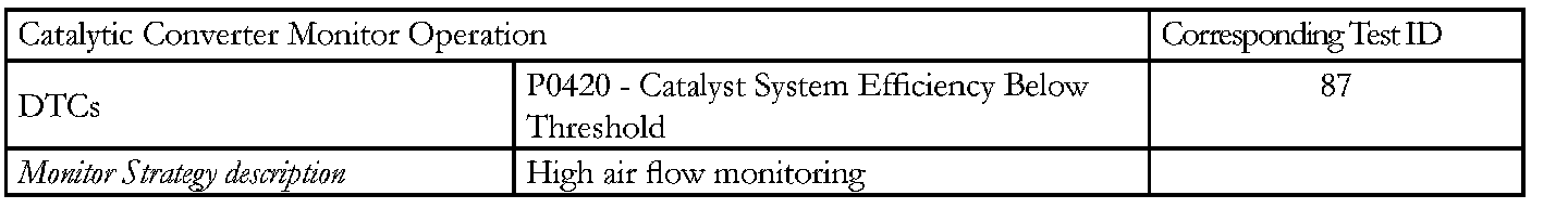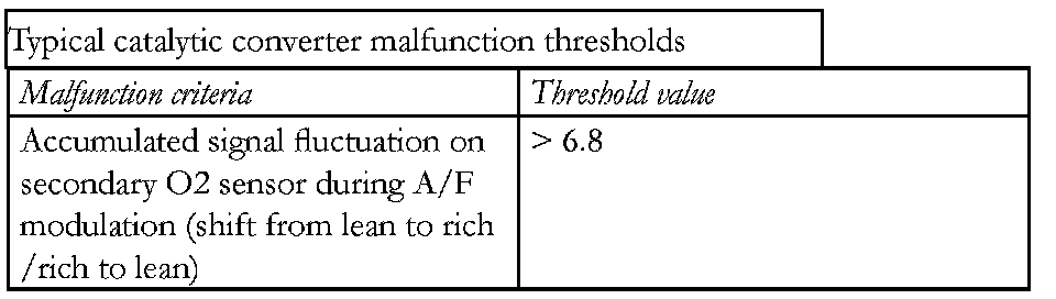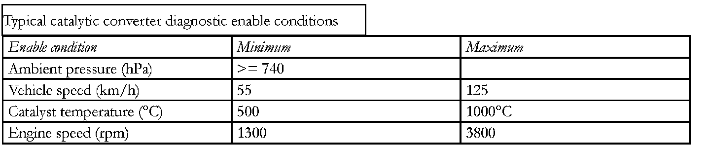 The three-way catalytic converter (TWC) stores oxygen found in the exhaust gases and uses it to make toxic gases less dangerous. The catalytic converter is a TWC converter in which hydrocarbons (HC) and carbon monoxide (CO) are oxidized and oxides of nitrogen (NOx) are reduced. As the TWC ages its ability to store oxygen drops. This reduces the conversion capacity of the TWC. To avoid dangerous emissions the ECM checks TWC efficiency. This check is carried out as follows.
