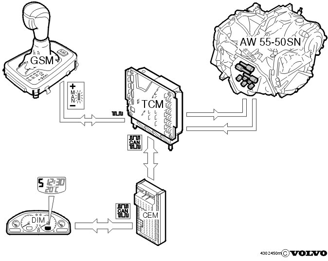 The shift solenoids S1, S2, S3, S4 and S5 are positioned in the valve body in the transmission control system, which is mounted on the front edge of the transmission. The shift solenoids (on/off type), consist of an electrical coil which controls a hydraulic valve. The solenoids are supplied with 12 V via the transmission control module (TCM) and grounded in the control system. The shift solenoids control shifting and the transmission control module (TCM) determines which gear is to be used by activating them in different patterns.