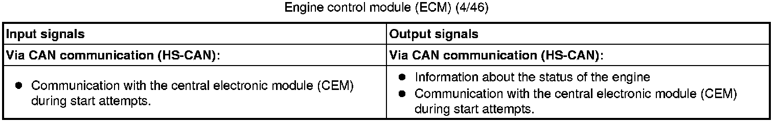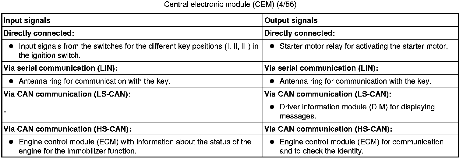 The tables below summarize the input and output signals to the units in the system for the immobilizer. The signal types are divided into directly connected signals, serial communication and controller area network (CAN) communication.