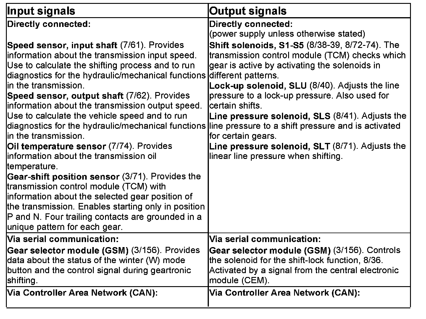 The table summarizes the input signals to and output signals from the Transmission Control Module (TCM). The signal types are divided into directly connected signals, serial communication and Controller Area Network (CAN) communication. The following illustration displays the same information with the Volvo component designations.