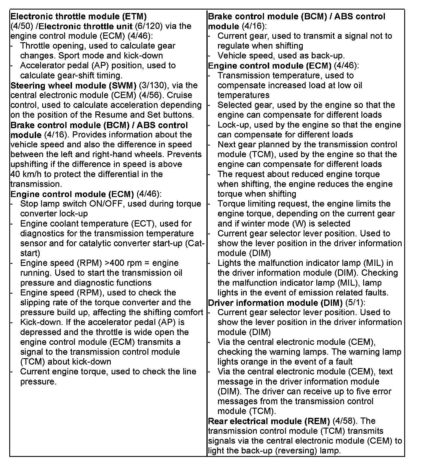 The Transmission Control Module (TCM) receives information about the desired gear position and driving mode from the driver. In conjunction with the signals from a number of sensors in the transmission and the engine control system, unlike with a purely hydraulically controlled transmission, this allows the control module to calculate the optimal shifting points and engagement of lock-up. The control module allows for small changes in the operating conditions and adapts the various transmission functions to ensure that the correct gear is always selected in relation to the driving mode selected by the driver.