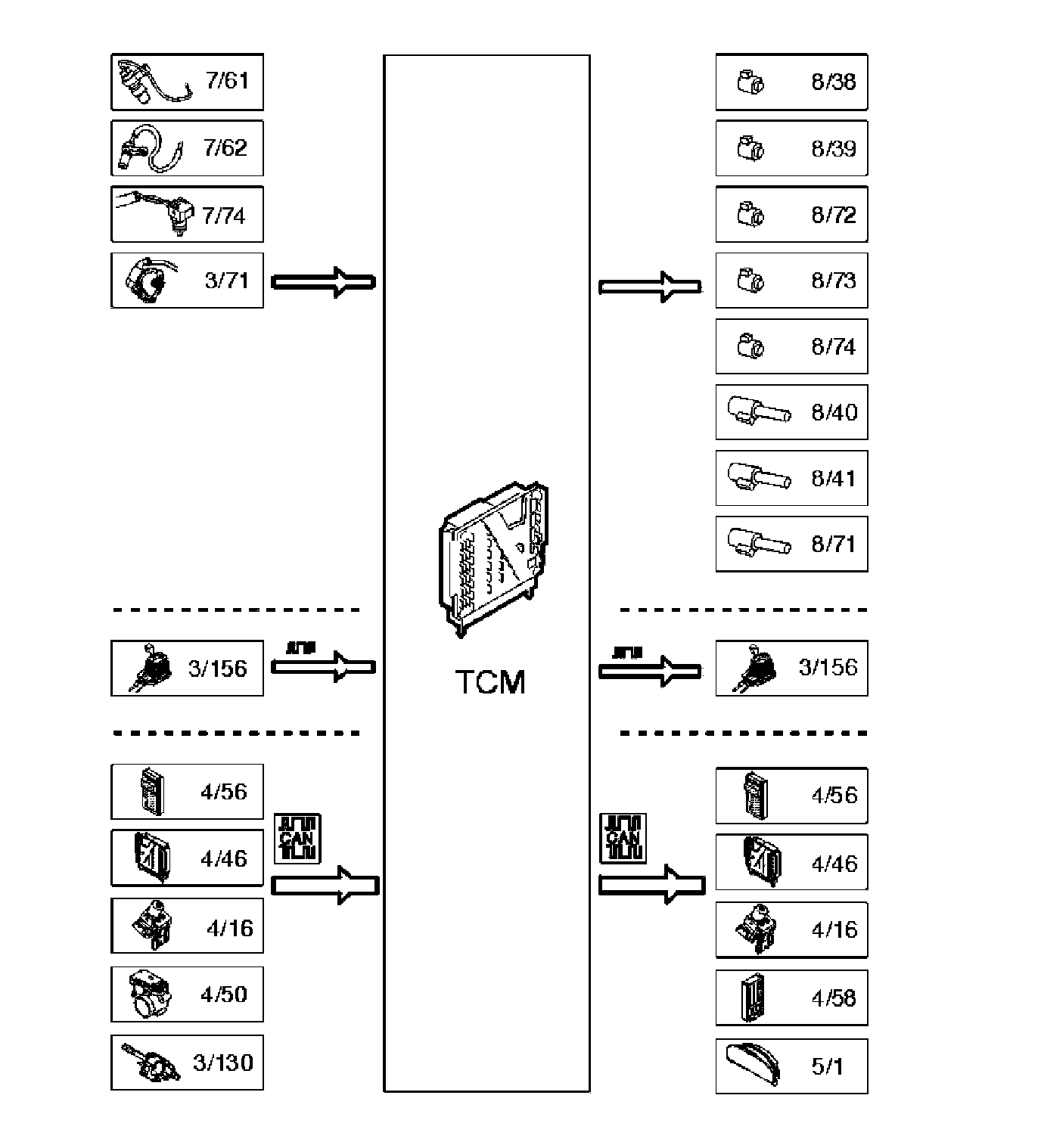 - Transmission Control Module (TCM)-Controls activation and deactivation of the solenoids by processing the signals from components such as the transmission input and output speed sensors and the temperature sensor. Also stores adaptive data as well as Diagnostic Trouble Codes (DTCs) and frozen values for diagnostics