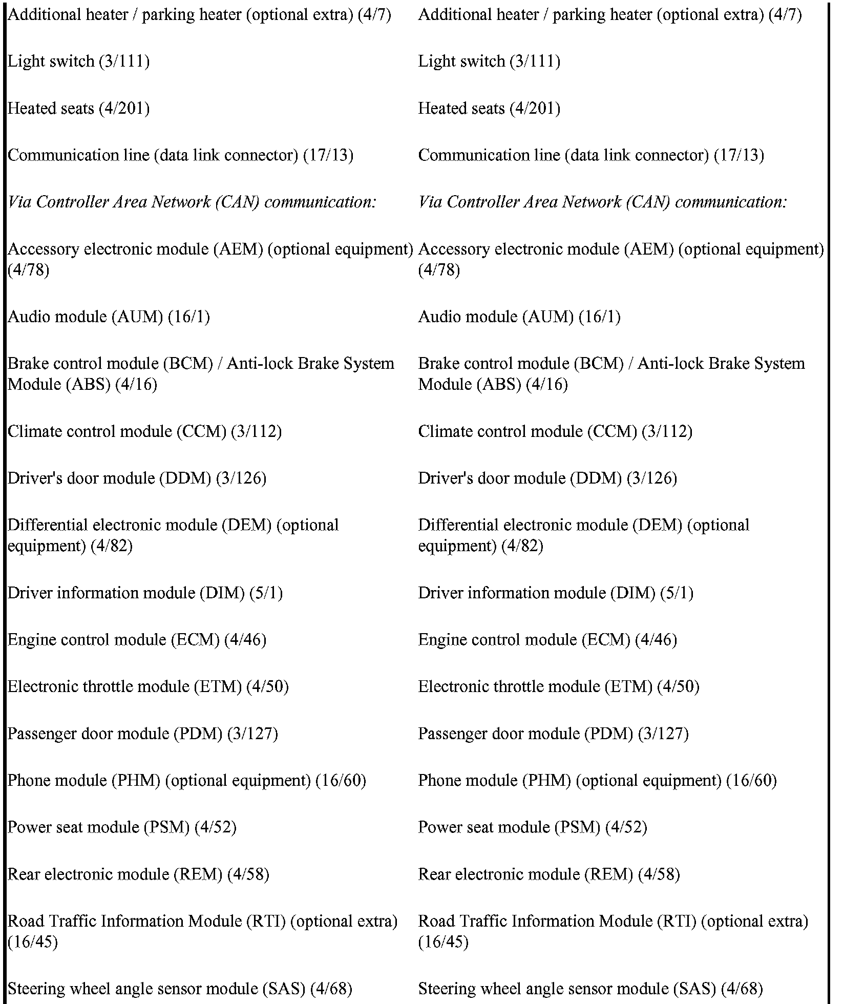 The central electronic module (CEM) communicates with components which are directly connected and also with other control modules and components via serial communication and the control area network (CAN).