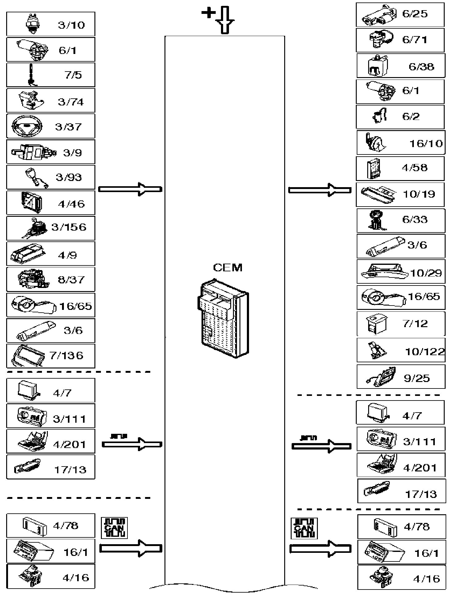 The central electronic module (CEM) controls the Controller area network (CAN) and acts as a bridge between the high and low speed networks and the data link connector (DLC). It also manages the following functions: