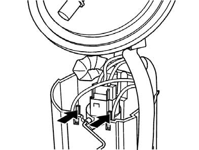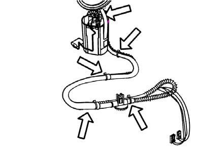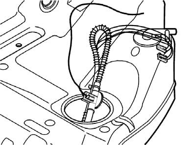 Note: Secure a wire in the area of the ejector. The wire must be sufficiently long that it reaches over to the opposite side of the tank with some excess remaining to ensure that it does not slide into the tank. The wire is needed to pull the hoses and wiring back to the left-hand side of the tank after the fuel tank unit has been replaced.