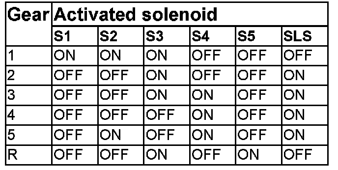Shifting and the lock-up function is controlled by activating the solenoids in a specific pattern. The solenoids S1-S5 determine which gear is to be used and the SLS, SLU and SLT solenoids determine engagement by adjusting hydraulic line pressure. The basic parameters for the different shifting points are the accelerator pedal (AP) position and the vehicle speed. The shift quality is decided by the control of torque. The pressurization of the clutches and the brakes are adjusted by reading the changes of the speed of the transmission input shaft during the shifting process and comparing them to the values calculated in the transmission control module (TCM).