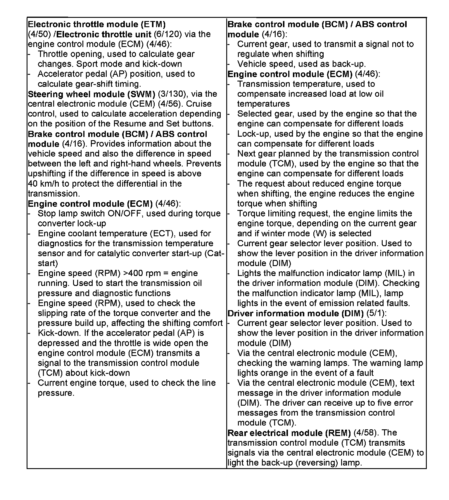 The transmission control module (TCM) receives information about the desired gear position and driving mode from the driver. In conjunction with the signals from a number of sensors in the transmission and the engine control system, unlike with a purely hydraulically controlled transmission, this allows the control module to calculate the optimal shifting points and engagement of lock-up. The control module allows for small changes in the operating conditions and adapts the various transmission functions to ensure that the correct gear is always selected in relation to the driving mode selected by the driver.