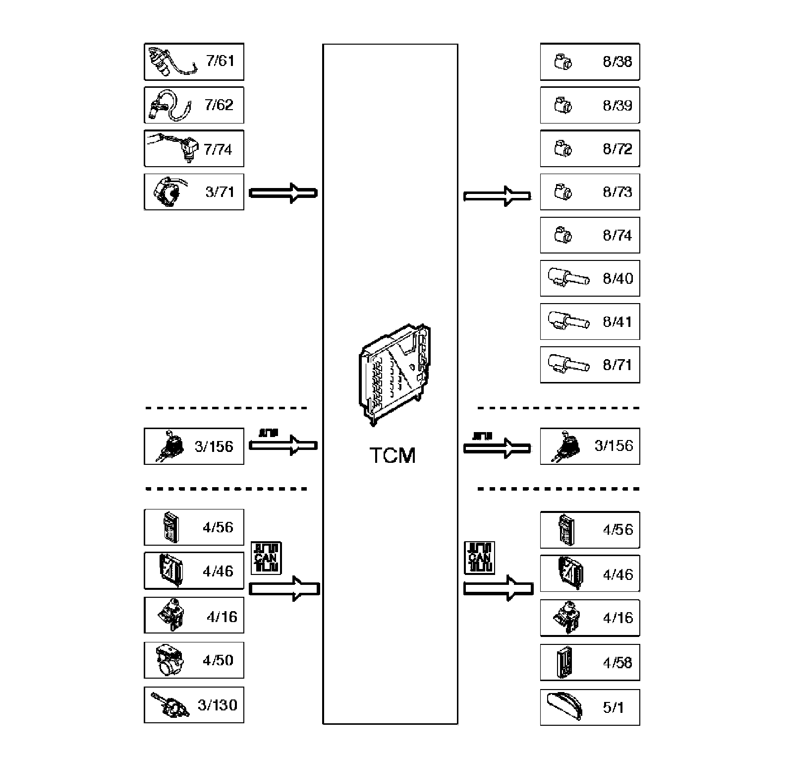- Transmission control module (TCM) - Controls activation and deactivation of the solenoids by processing the signals from components such as the transmission input and output speed sensors and the temperature sensor. Also stores adaptive data as well as diagnostic trouble codes (DTCs) and frozen values for diagnostics