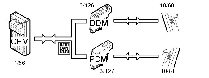 Window control is activated via switches on the driver door module (DDM) (3/126) and passenger door module (PDM) (3/127). The motor for the power window on the driver's side (6/58) is controlled directly from the driver door module (DDM). The motor for the power window on the passenger side (6/60) is controlled via CAN communication from the driver door module (DDM) to the passenger door module (PDM). The signals for operating the rear windows are transmitted from the driver door module (DDM) via the controller area network (CAN) to the central electronic module (CEM) (4/56), which manages the rear window functions.