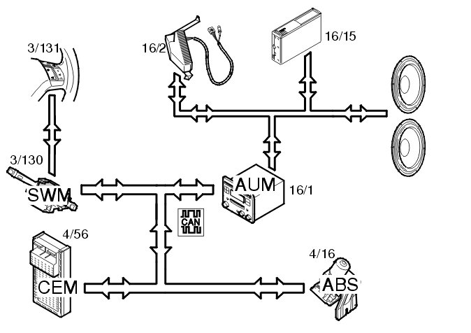The steering wheel module (SWM) communicates with the audio module (AUM) via the Controller area network (CAN).