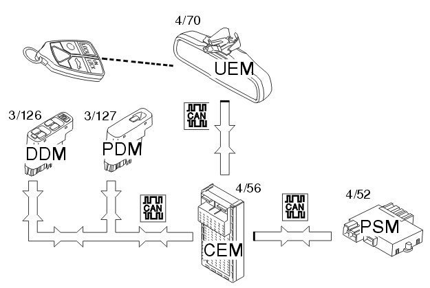 The signal from the remote control is transmitted to the upper control module (UEM) (4/70) when the car is locked or unlocked. The upper electronic module (UEM) also identifies which remote control is being used. The central electronic module (CEM) (4/56) receives this information from the upper electronic module (UEM). The central electronic module (CEM) identifies and stores the remote control which is being used and determines the data to be sent to the power seat module (PSM) (4/52), driver door module (DDM) (3/126) and passenger door module (PDM) (3/127). This is done when the door is opened.