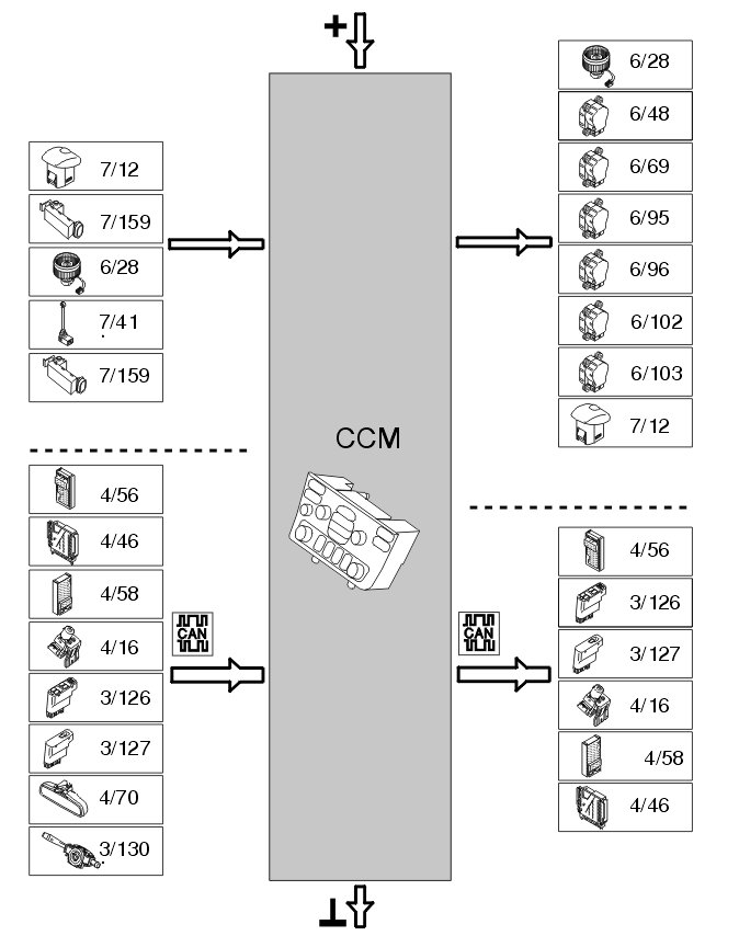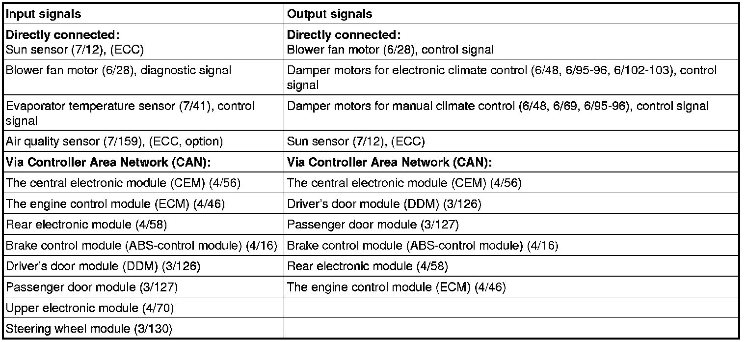 The table below summarizes input and output signals to and from the climate control module. The signal types are divided into directly connected signals, serial communication and Controller area network (CAN) communication. The illustration below displays the same information with the Volvo component designations.