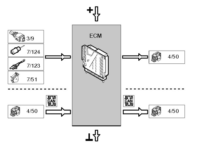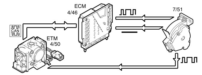 The Engine control module (ECM) sends the request about the desired throttle angle to the Electronic throttle module (ETM) via CAN. The Electronic throttle module (ETM) fulfils the desired throttle angle and sends the information about the current throttle position back to the Engine control module (ECM) via CAN.