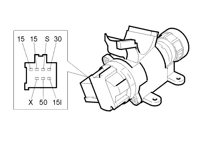 The Engine Control Module (ECM) uses the signal from the ignition switch to detect when the ignition key has been turned to position II or III. When the key is in the ignition position (position II) or starting position (position III) a high signal (Ubat) is transmitted from the ignition switch to the engine control module (ECM). The engine management system prepares for start-up (for example, temporarily activates the fuel pump (FP) relay). When the flywheel in the engine rotates, the engine speed (RPM) sensor signal is used to keep the fuel pump (FP) relay activated.