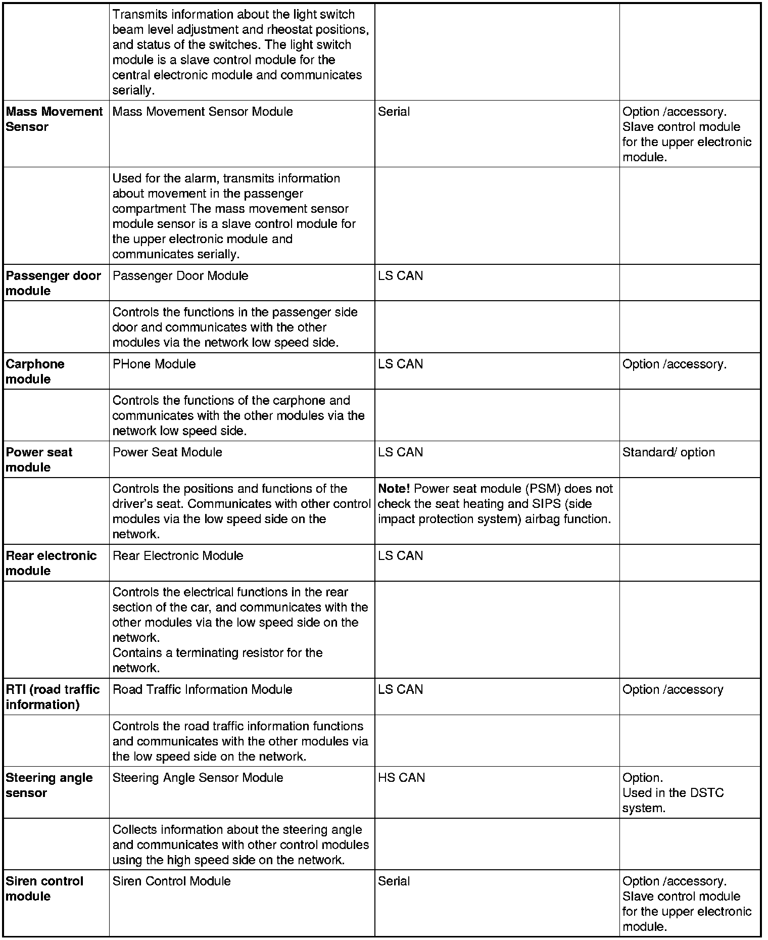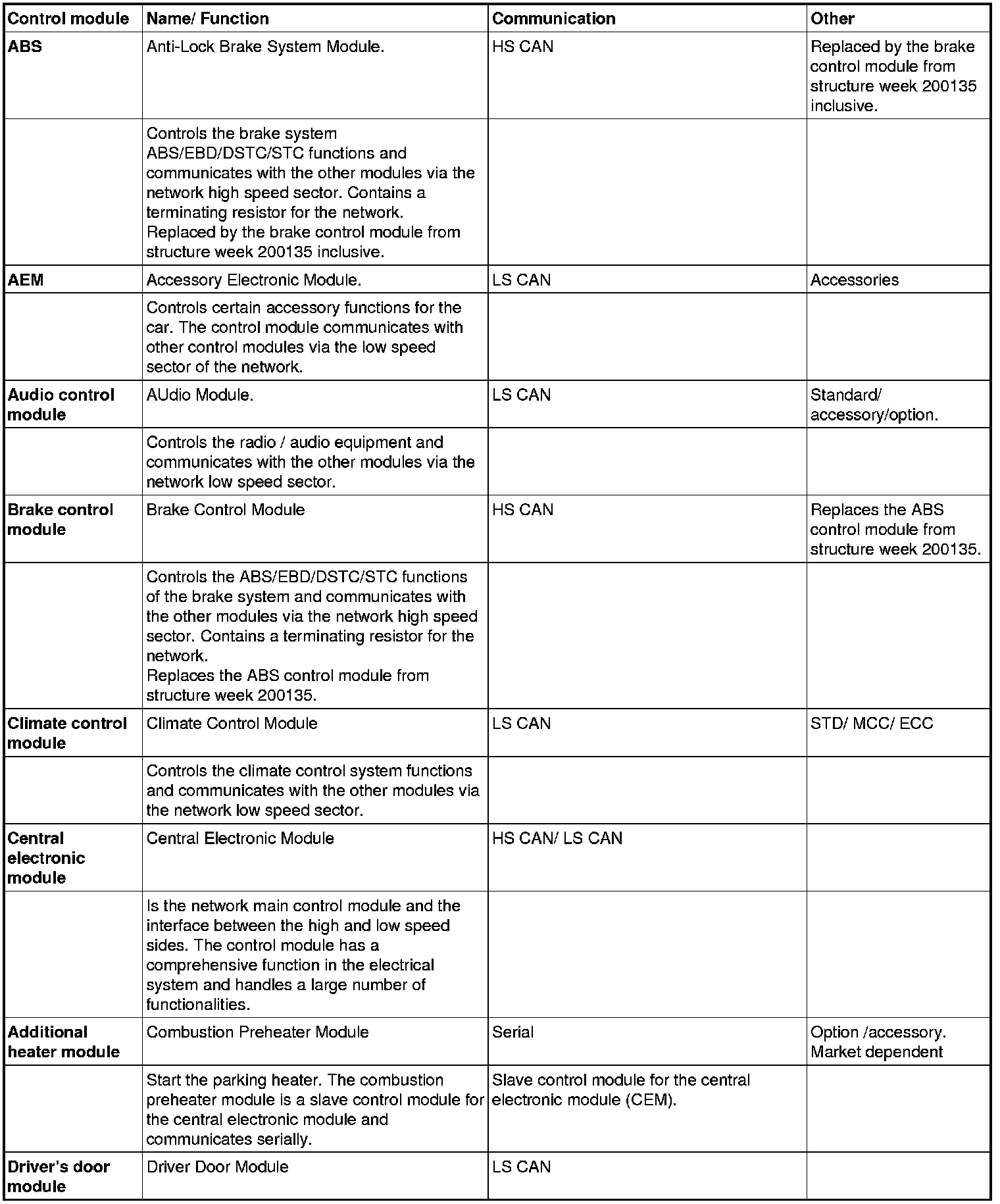 The number of control modules in the CAN varies depending on the level of equipment, the car model and the structure week. The description applies to the structure week 199815-200149. The structure week and the manufacture week are not necessarily the same week. The week of manufacture is the week in which the car was manufactured in the factory. The content of the car is guided by the structure week A structure week can extend over many manufacture weeks. The structure week is specified in the format YYYYWW.