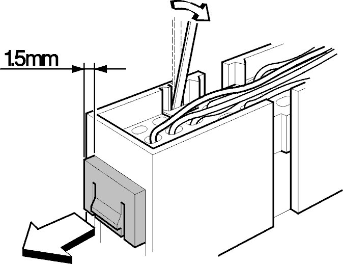 - Insert a small screwdriver (approx. 3 mm blade width) as shown. Bend the secondary locking catch outward carefully and push the locking cover forwards 1.5 mm.
