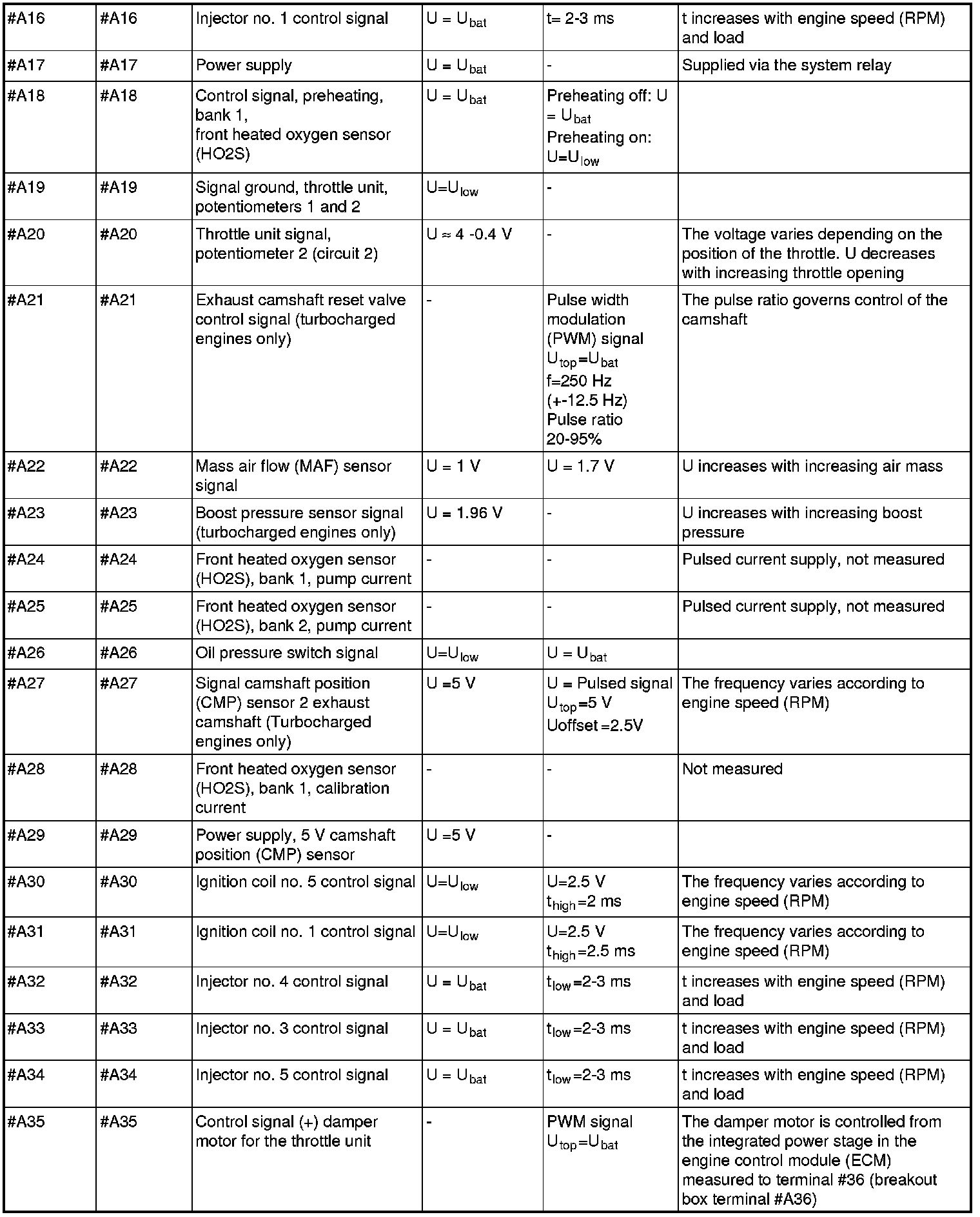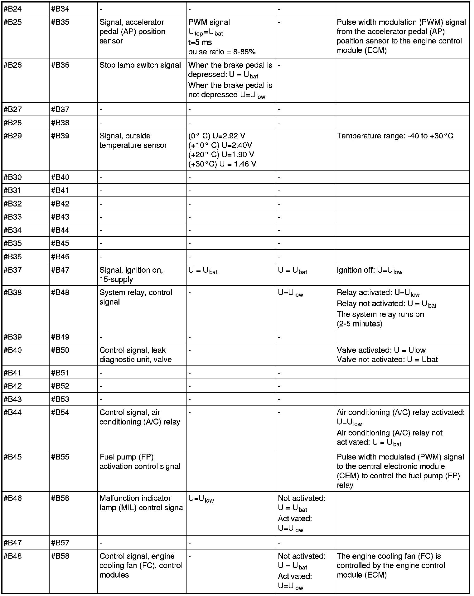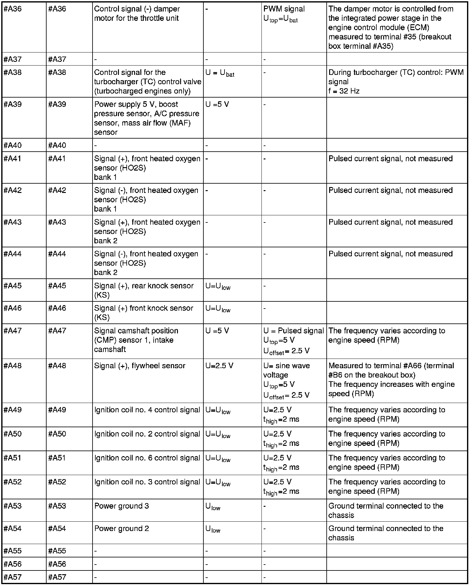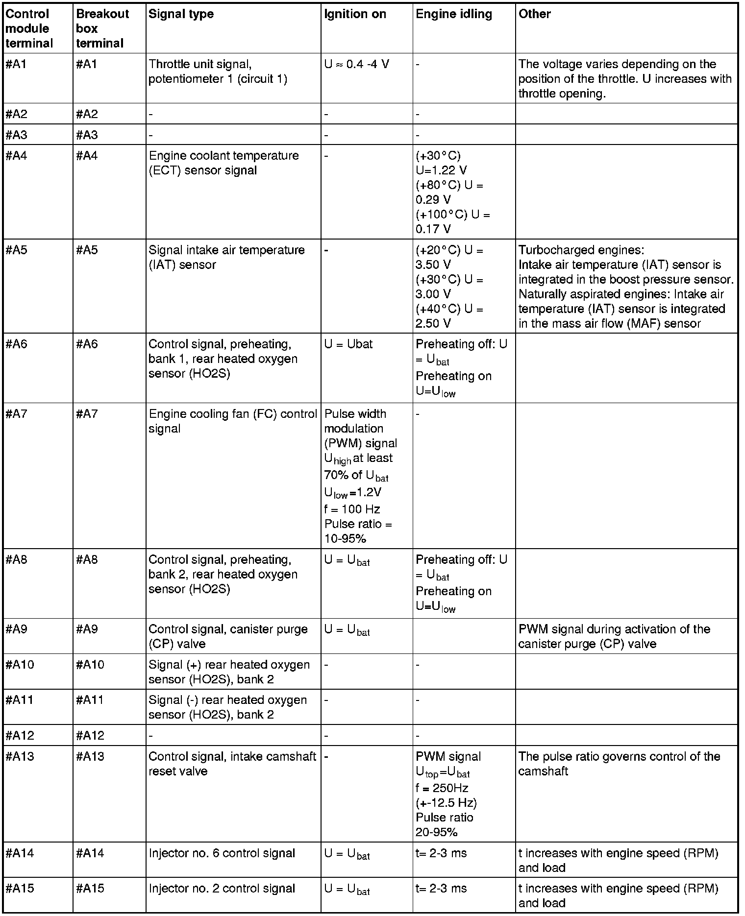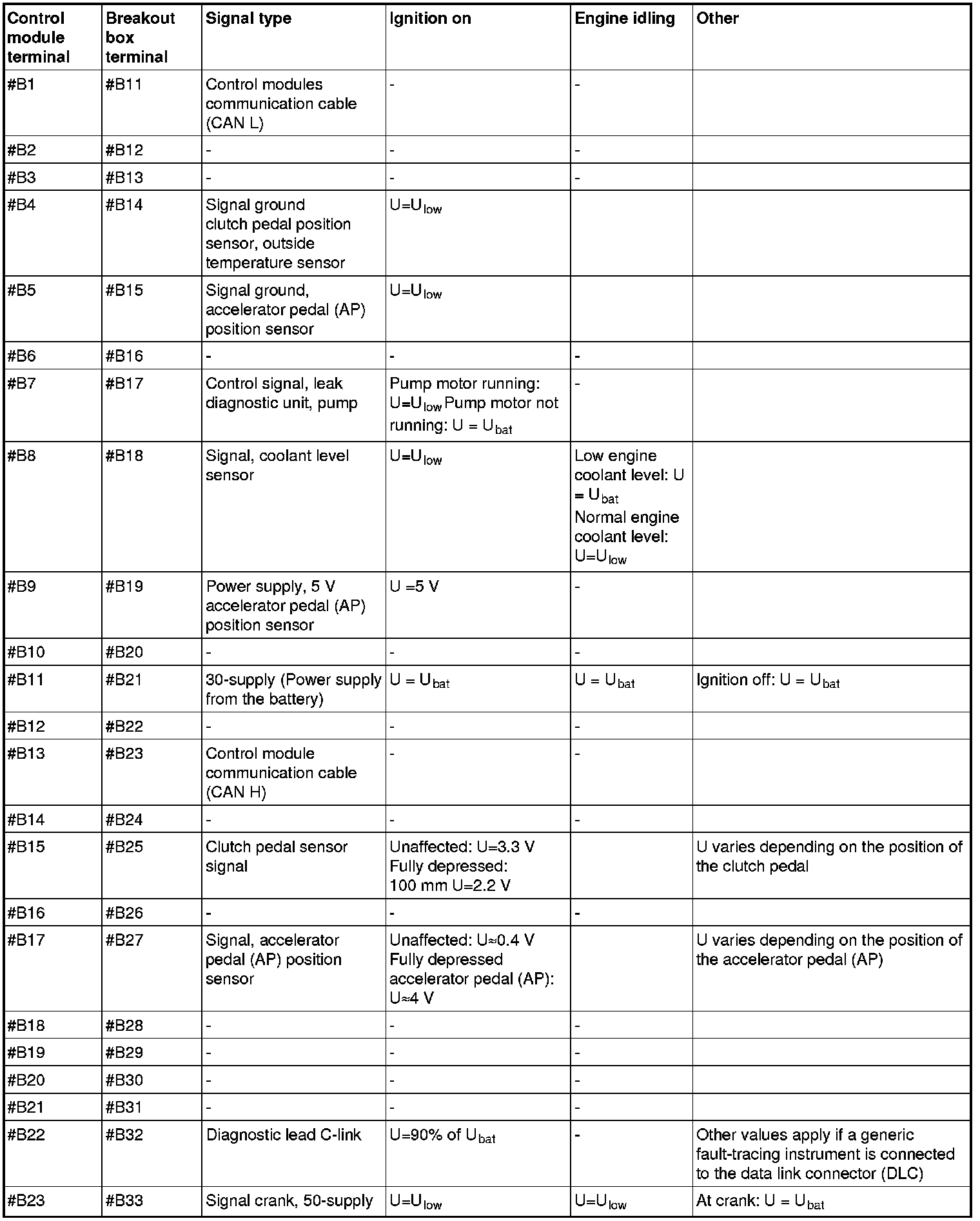 All values listed below should be measured between the respective terminal in column 1 (control module terminal) and terminal #B3 unless stated otherwise in column 6 (Other). Control module terminals #A1-#A70 correspond to terminals #A1-#B10 on the breakout box, terminals #B1-#B50 correspond to #B11 - #B60 on the breakout box.