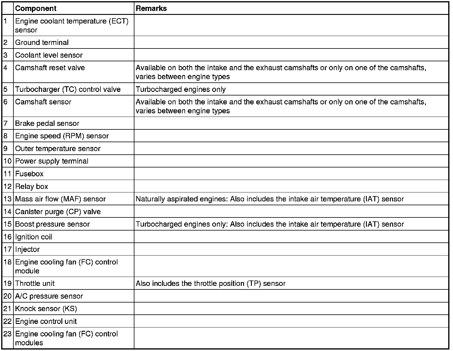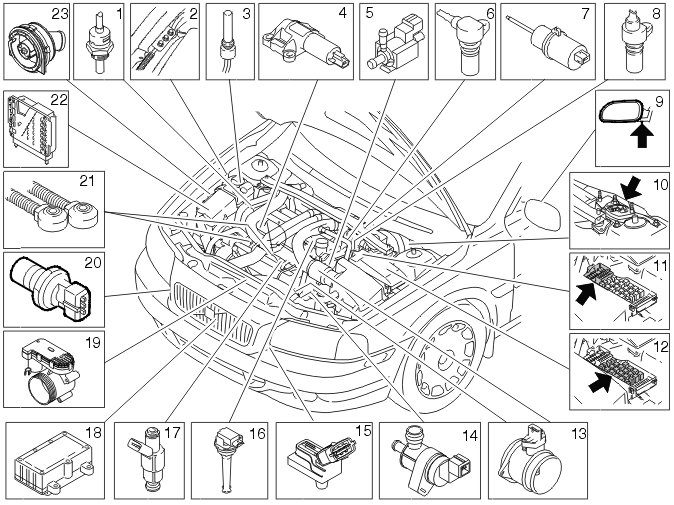 Not all the following components are necessarily in the car. The components vary between engine types.