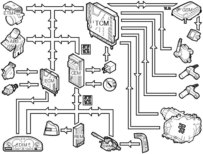 The table below summarizes the input signals to and output signals from the transmission control module (TCM). The signal types are divided into directly connected signals, serial communication and Controller area network (CAN) communication. The following illustration displays the same information with the Volvo component designations.