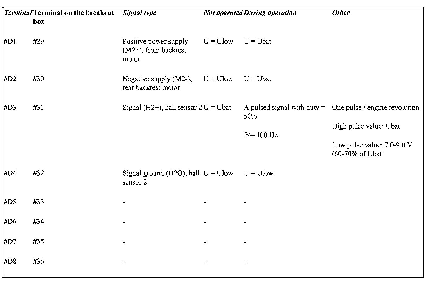 Terminals D1-D8 correspond to terminals 29-36 on the breakout box.