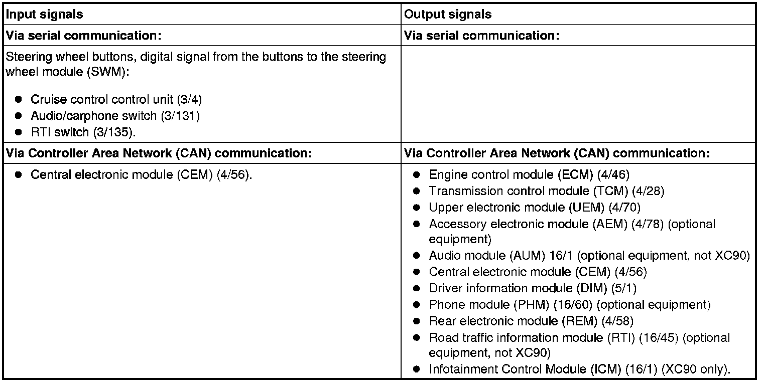 The table below summarizes the input signals to and output signals from the steering wheel module (SWM). The signal types are divided into directly connected signals, serial communication and Controller area network (CAN) communication. The following illustration displays the same information with the Volvo component designations.