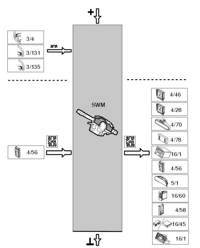 The steering wheel module (SWM) communicates with directly connected components and communicates with other control modules via the Control Area Network (CAN).