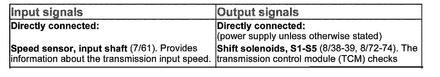 The table summarizes the input signals to and output signals from the transmission control module (TCM). The signal types are divided into directly connected signals, serial communication and Controller area network (CAN) communication. The following illustration displays the same information with the Volvo component designations.