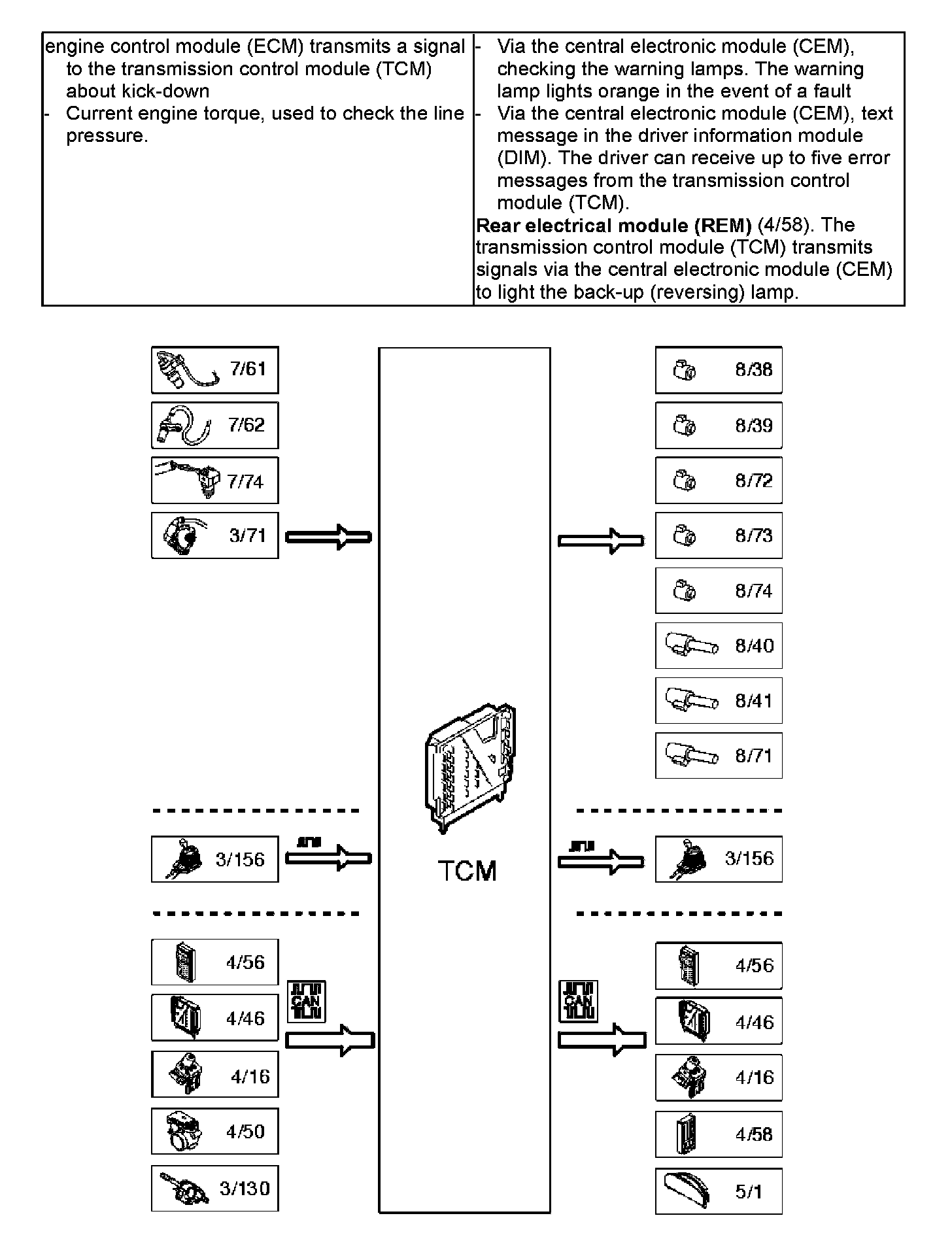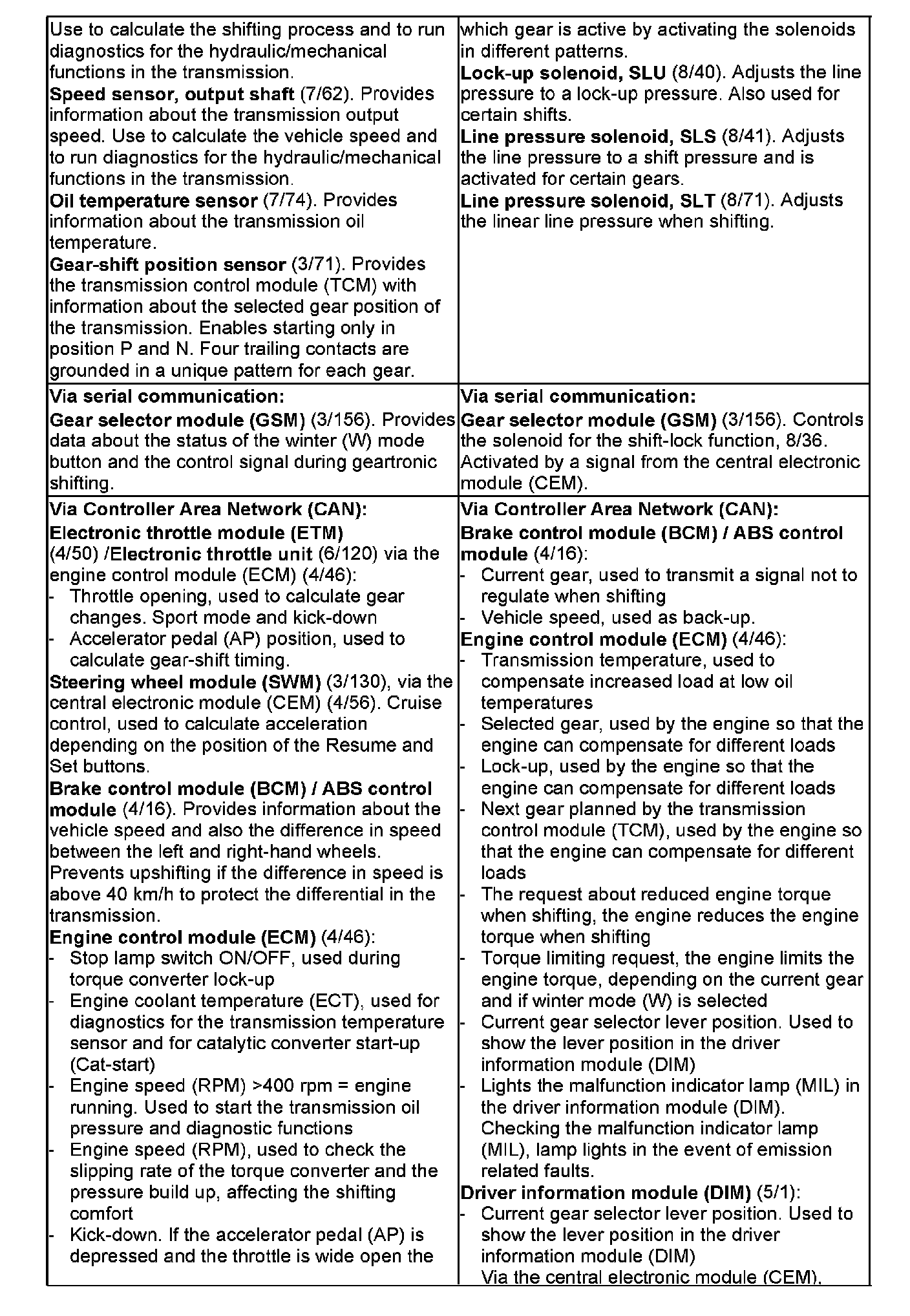 The transmission control module (TCM) receives information about the desired gear position and driving mode from the driver. In conjunction with the signals from a number of sensors in the transmission and the engine control system, unlike with a purely hydraulically controlled transmission, this allows the control module to calculate the optimal shifting points and engagement of lock-up. The control module allows for small changes in the operating conditions and adapts the various transmission functions to ensure that the correct gear is always selected in relation to the driving mode selected by the driver.