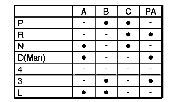 The gear-shift position sensor is mounted on the top of the transmission housing, on the gear shift linkage rod. The gear selector contains a Park/Neutral position (PNP) switch and connectors which inform the transmission control module (TCM) about which gear is selected and if the back-up gear is selected so that the reversing lamps can be lit. The gearshift position sensor is a position switch which is supplied via +15. A number of trailing contacts supply power to the sensor outputs. The combination of pins A, B. C and PA indicate the current gear selector position (see the table). The trailing contacts can either be closed or open.