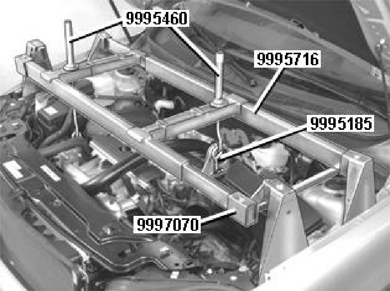 Position lifting beam 999 5716 on the wheel arch and directly above the engine lifting lug on the left and right-hand sides.