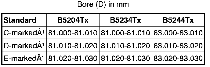 (1)The bore classification is stamped on top of the engine block. For example: 1CCDDE is read as cyl 1 = C, cyl 2 = C, cyl 3 = D, cyl 4 = D, cyl 5 = E.