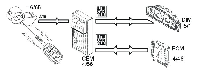 The immobilizer system is activated when the ignition key is turned to position 0 and the engine stops. The engine control module (ECM) then sends a command to the central electronic module (CEM) that the starter motor is no longer permitted to turn.