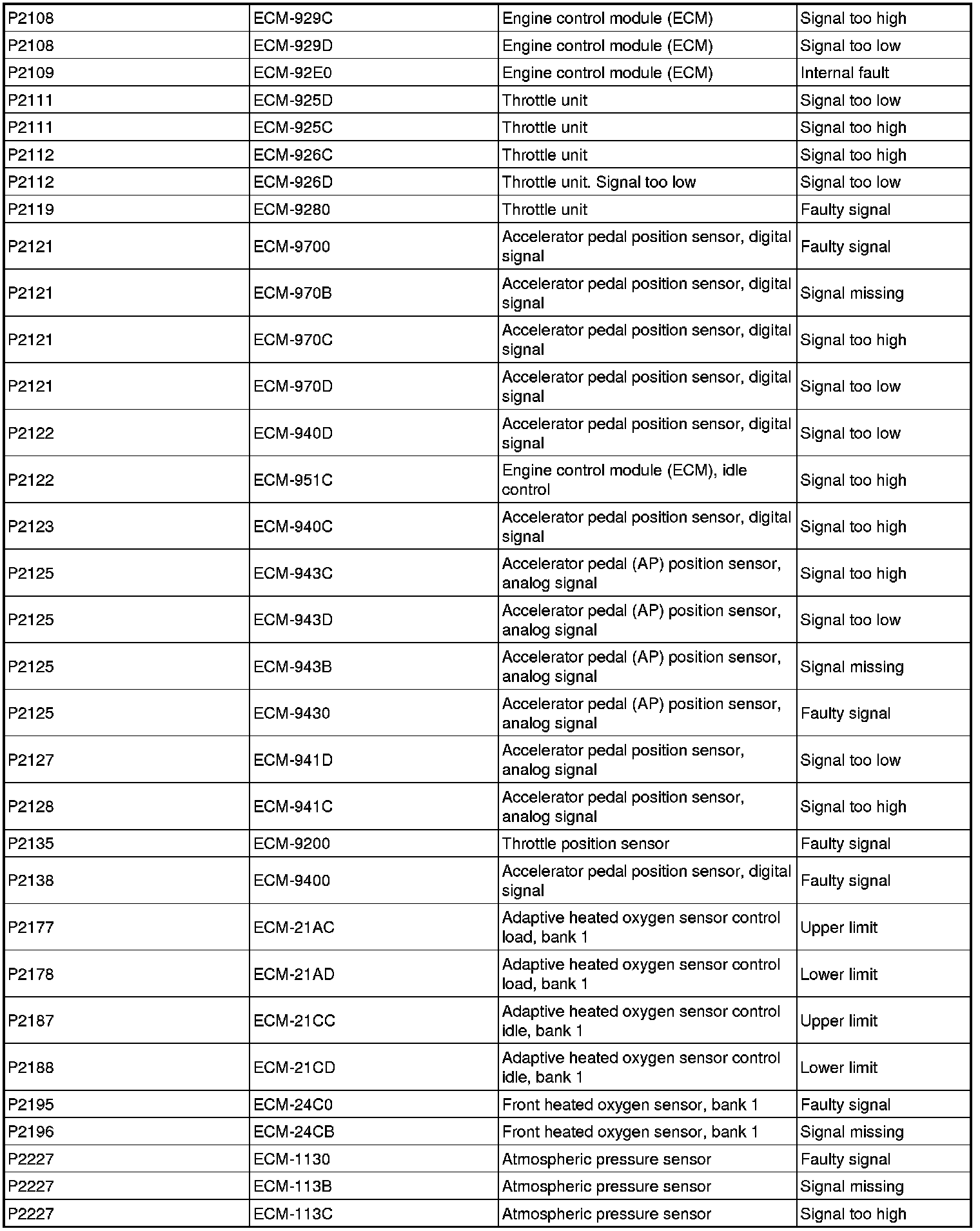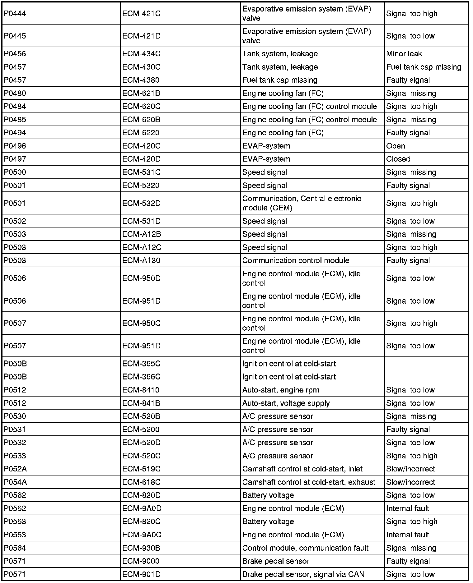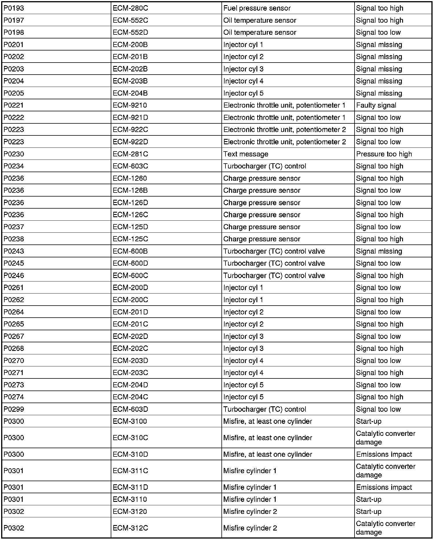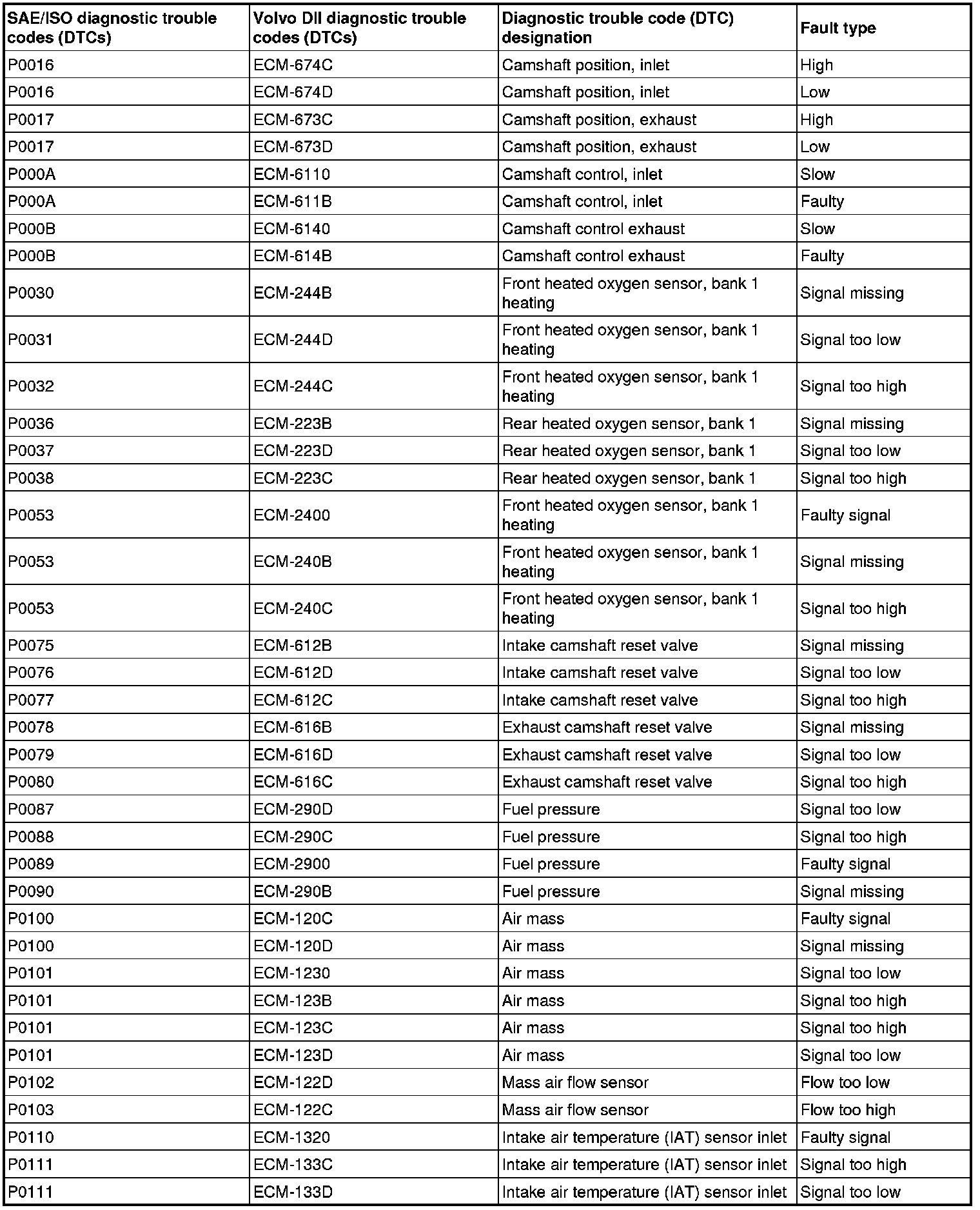 The table below is a conversion table between standardized diagnostic trouble codes (DTCs) (SAE/ISO) and the equivalent Volvo diagnostic trouble codes (DTCs) (DII).