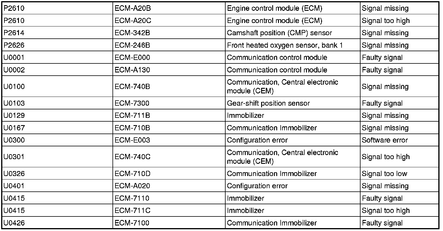 Note! An SAE/ISO diagnostic trouble code can correspond to several DII diagnostic trouble codes. Therefore, all of these must by rectified in order for the corresponding SAE/ISO diagnostic trouble code to disappear.Several SAE/ISO diagnostic trouble codes may also refer to the same DII diagnostic trouble code.There are DII diagnostic trouble codes for non emission-related problems that do not correspond to any SAE/ISO diagnostic trouble code.