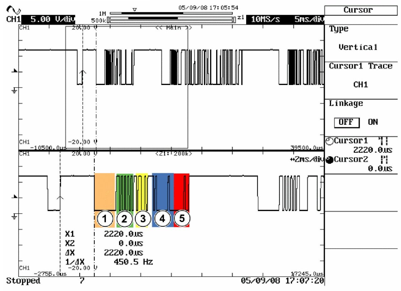 If you have access to an oscilloscope and measure on the LIN bus, a start-up procedure with subsequent communication can appear as illustrated in the figure above.
