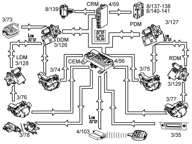 The vehicle is locked using the lock buttons on the door handles. During locking, the antenna is also activated to check that there is an authorized key in the vicinity of the vehicle. If the key is approved, the keyless vehicle module (KVM) transmits a signal to the central electronic module (CEM) to lock the vehicle.