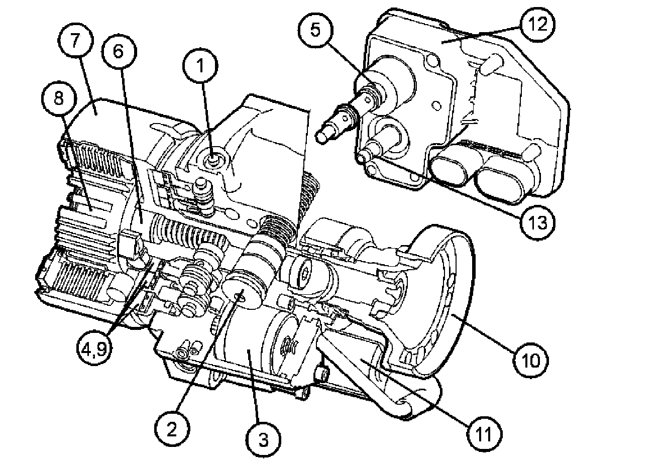 The hydraulic section consists of 1-5, the mechanical section consists of 6-10 and the electronic section consists of 11-13: