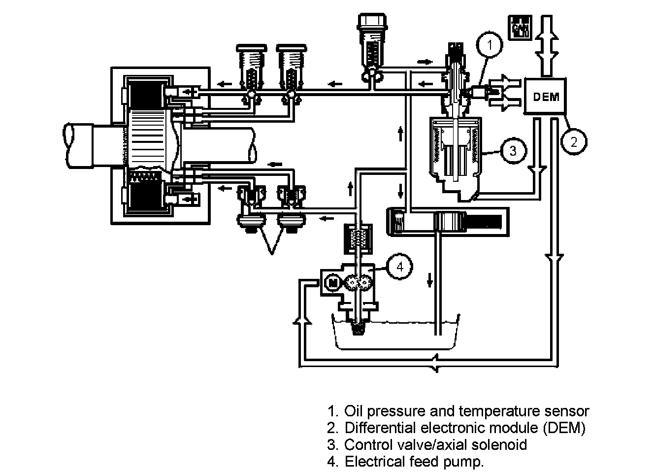 The differential electronic module (DEM) is secured directly to the coupling unit and forms a single unit with the axial solenoid and control valve. The differential electronic module (DEM) receives signals from the engine control module (ECM) and the brake control module (BCM) via the control area network (CAN). The differential electronic module (DEM) uses the sensor signals to control the oil pressure to the multi-plate clutch by adjusting the axial solenoid. The axial solenoid regulates the control valve constantly using a pulse width modulation (PWM) signal. The oil pressure for the multi-plate clutch determines the amount of torque which can be transferred to the rear wheels.