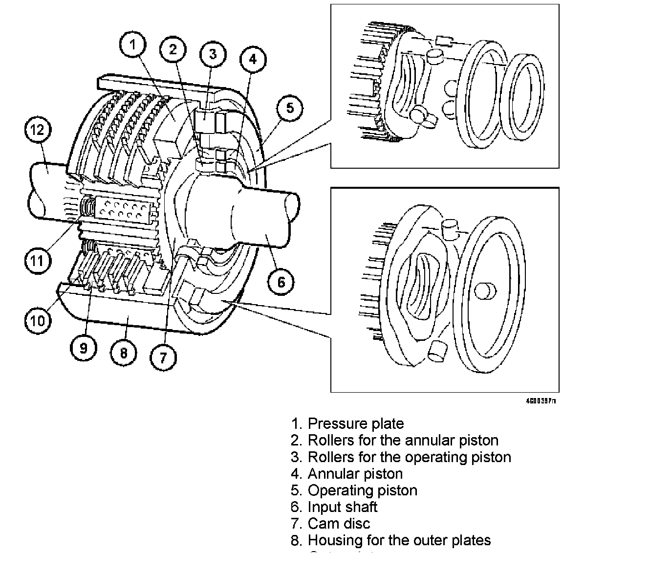 The annular piston rollers act on the cam disc to press the annular piston in and out. This creates an oil pressure which affects the operating piston, which in term engages the multi-plate clutch unit.