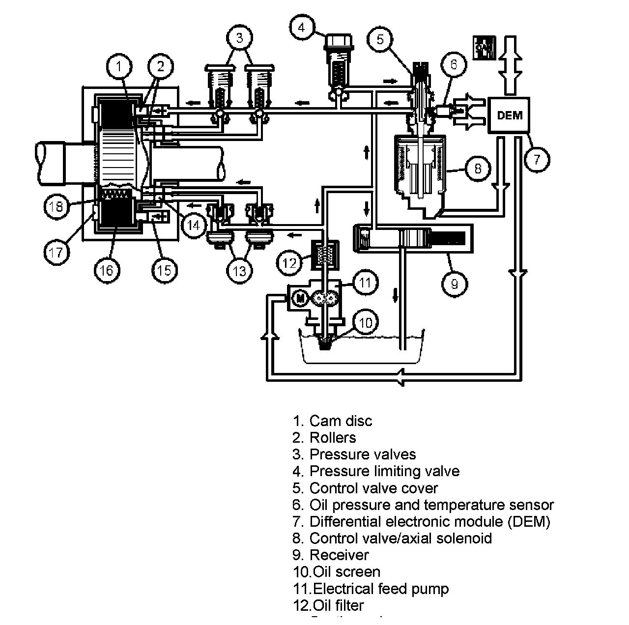 The electric feed pump is built into the coupling unit. The pump is supplied with power by the differential electronic module. When the engine is started and exceeds 400 rpm, the electrical feed pump receives power from the control unit.